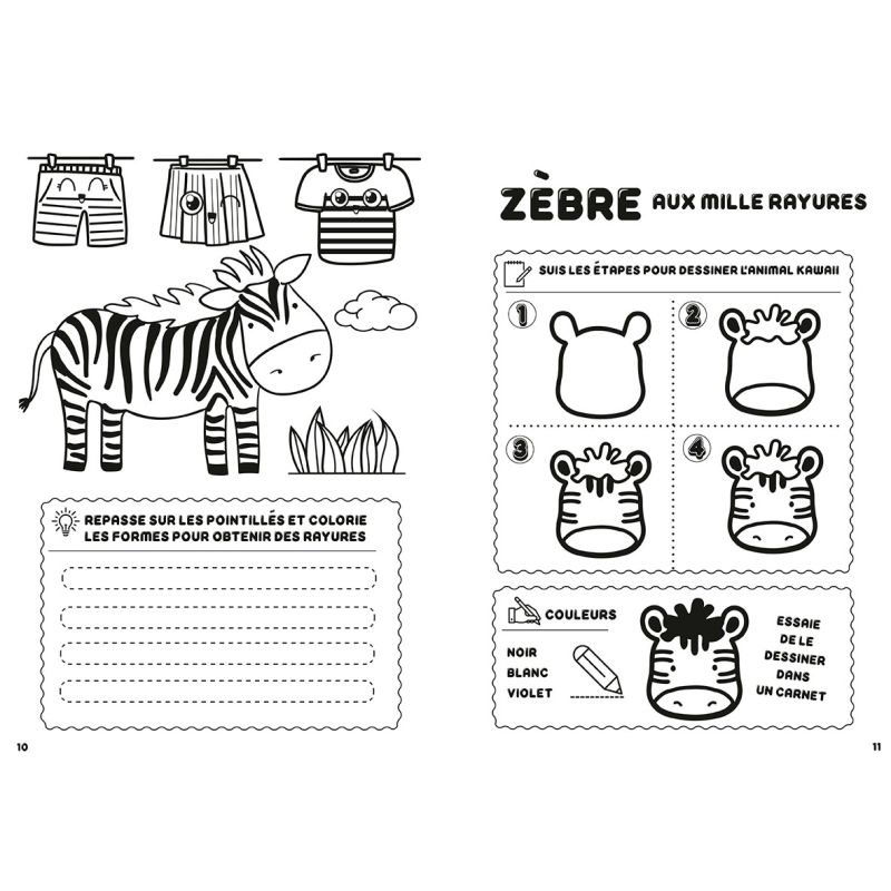 Pour compléter ces pas à pas, l'enfant peut colorier des scènes avec chaque animal, mais aussi s'entraîner à reproduire de nombreux autres motifs kawaii.