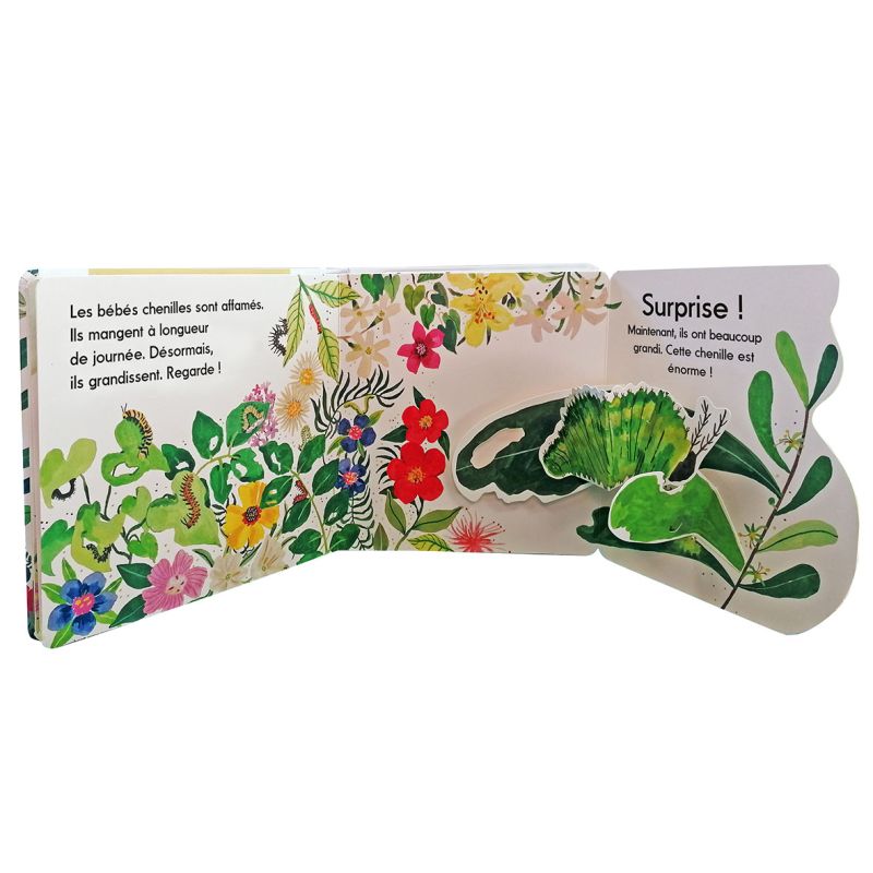 Un court texte explicatif est présent sur chaque double page. Pensés avec soin, ces textes apprennent aux enfants de la manière la plus simple possible l'évolution de l'insecte.