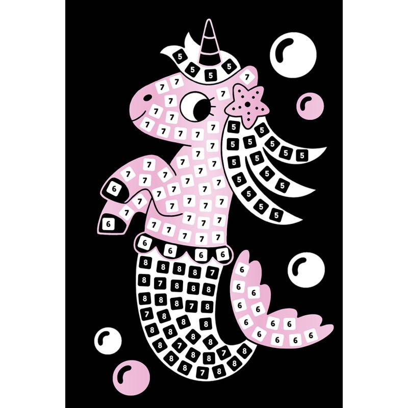 Créé tes propres mosaïques licornesques en décollant et en appliquant les gommettes métallisées sur les images numérotées.