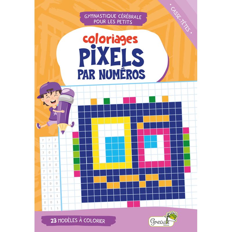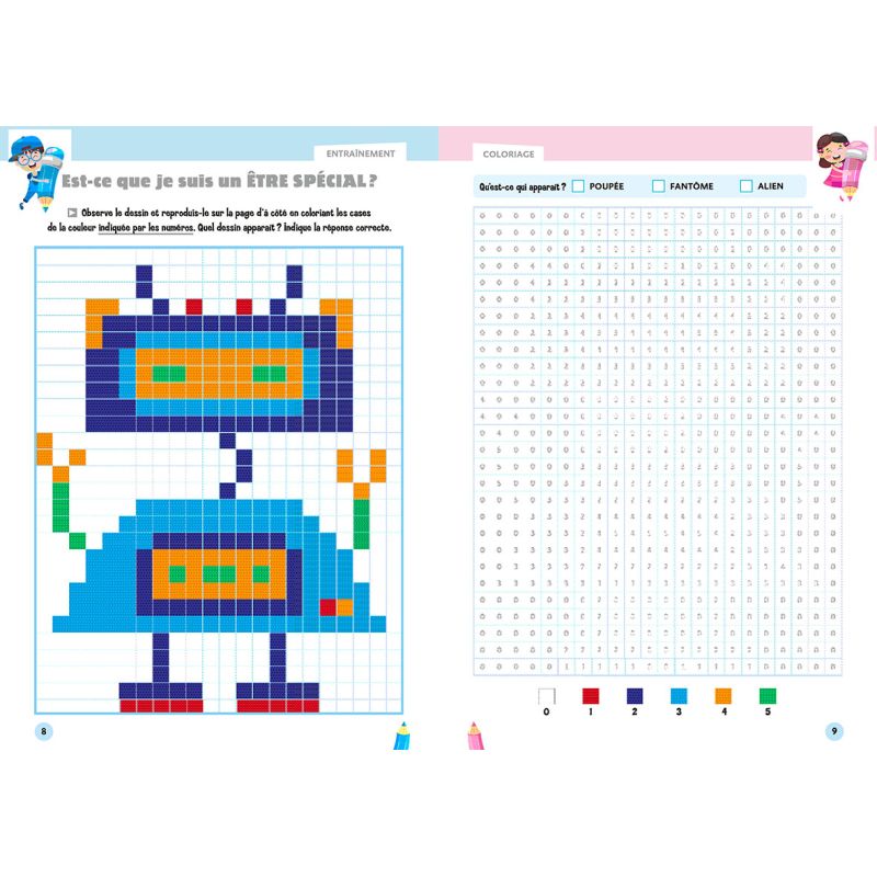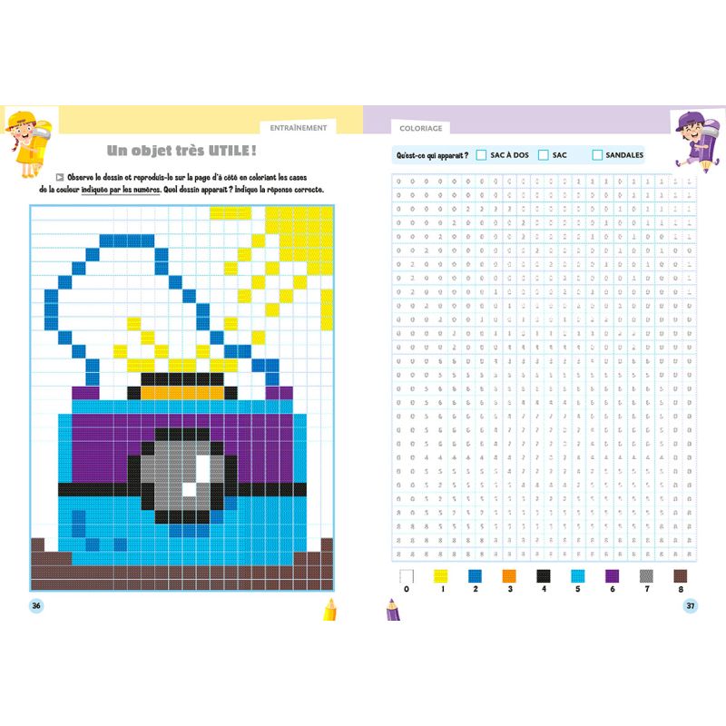 Inspirés des nonogrammes, ces coloriages sont adaptés aux enfants, qui doivent reproduire sur la page de droite ce qui figure sur la grille en page de gauche en respectant la couleur indiquée par le numéro. Ils doivent ensuite répondre à une petite question concernant le sujet qu'ils ont dessiné.