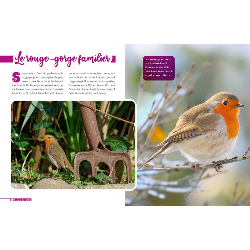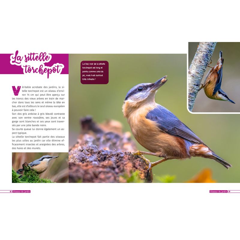 Au fil des pages, de courts paragraphes présentant les particularités de ces oiseaux complètent les photographies : comment les reconnaître grâce à leur plumage ou à leur chant, leurs habitats, de multiples petites anecdotes concernant leurs habitudes de vie etc.