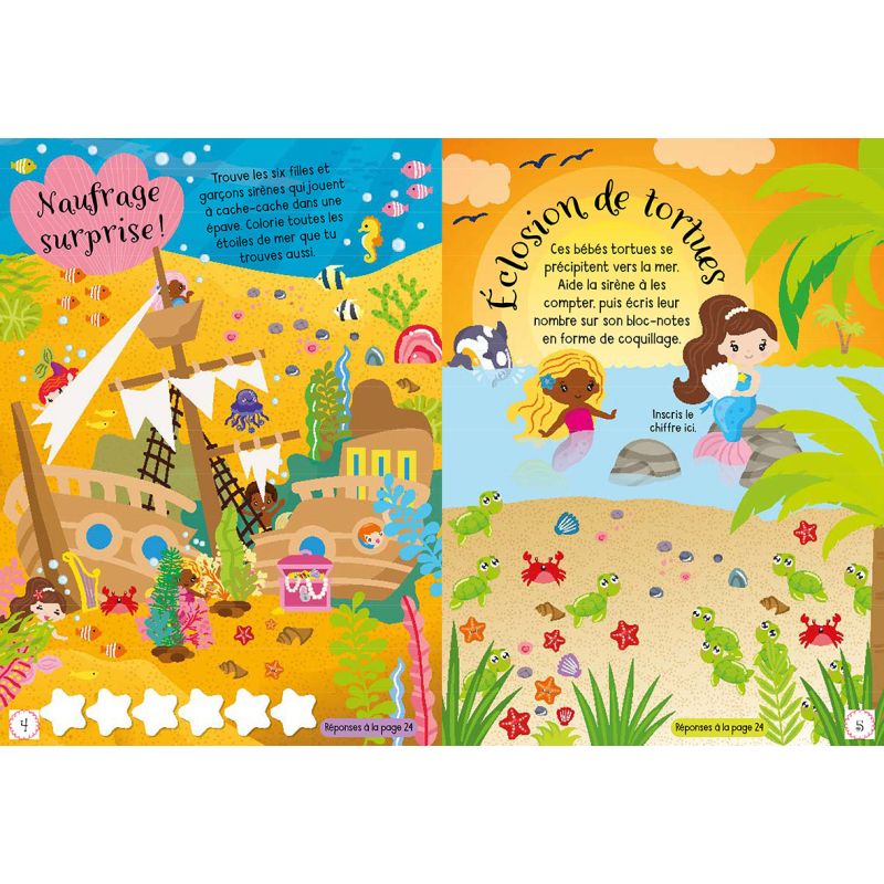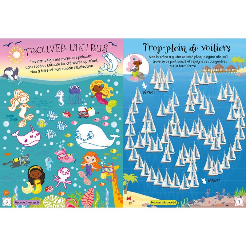 Une nouvelle collection de 4 titres de cahiers d'activités originales, drôles, solides et bien pensées. Le troisième thème de la collection concerne les sirènes et offre un panel d'activités et de jeux variés : un narval et un poisson-globe à détacher et à assembler pour jouer, un jeu de cartes memory, une pancarte à découper et accrocher à la porte de sa chambre, des jeux des différences, des coloriages, des labyrinthes etc. Points forts : Un cahier qui présente des activités manuelles variées Une fabrication de bonne qualité Plus de 100 autocollants brillants particulièrement mignons Un prix attractif.