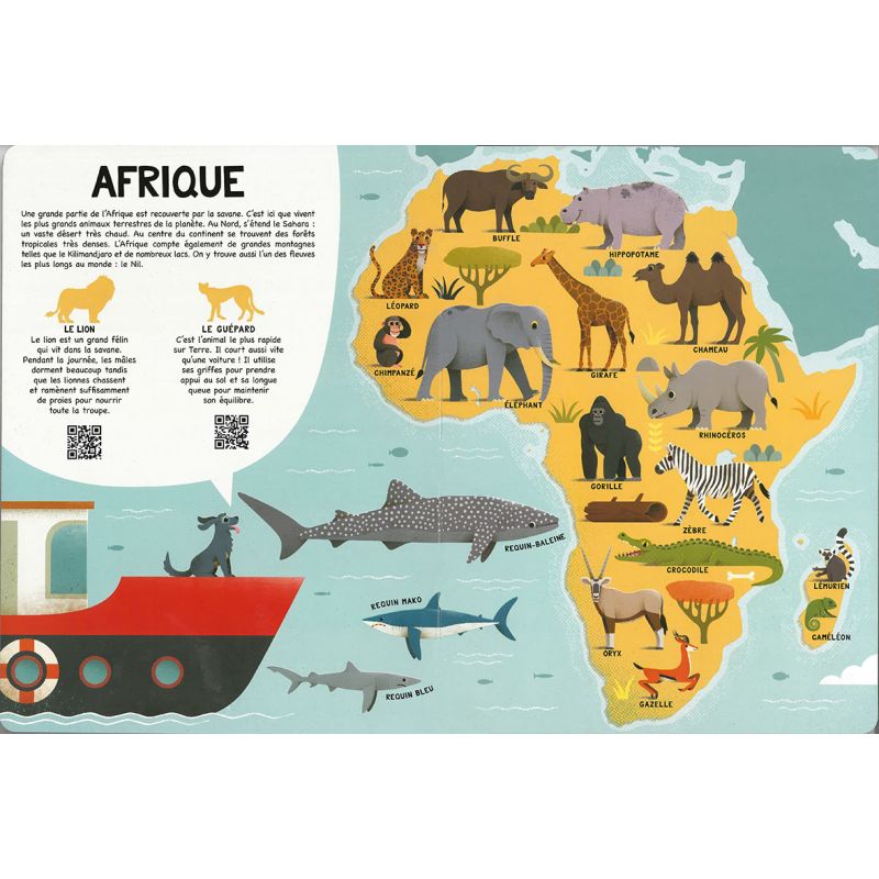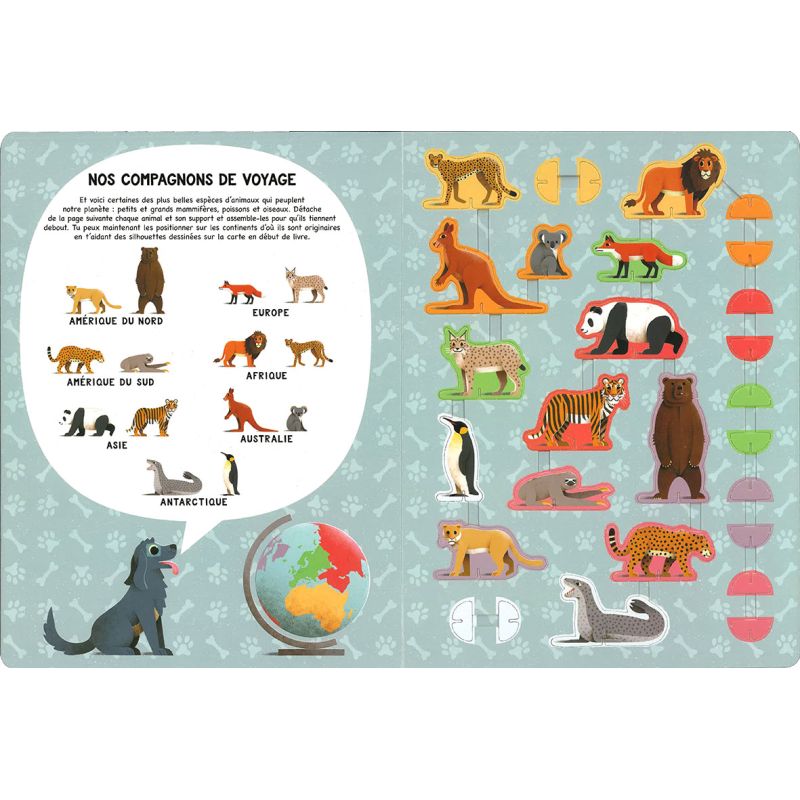 Dans ce bel album cartonné, Paco le petit chien nous embarque dans une grande aventure autour du monde pour découvrir les animaux qui peuplent chaque continent. Les espèces les plus emblématiques sont dessinées et localisées sur l'atlas, qui consacre une double-page par continent. Deux espèces animales sont ensuite présentées dans un court paragraphe agrémenté d'un QR code qui permet à l'enfant d'accéder à une petite vidéo documentaire d'une dizaine de secondes sur l'animal concerné. En fin d'ouvrage, 14 figurines avec leur support sont à détacher et à assembler, puis à positionner sur les continents dont ils sont originaires.