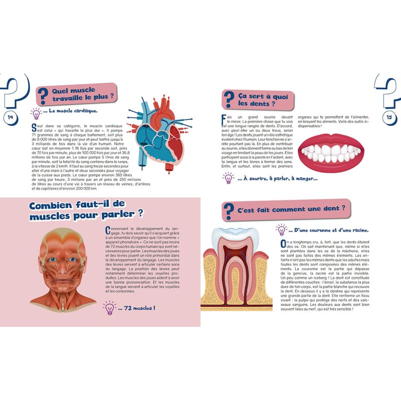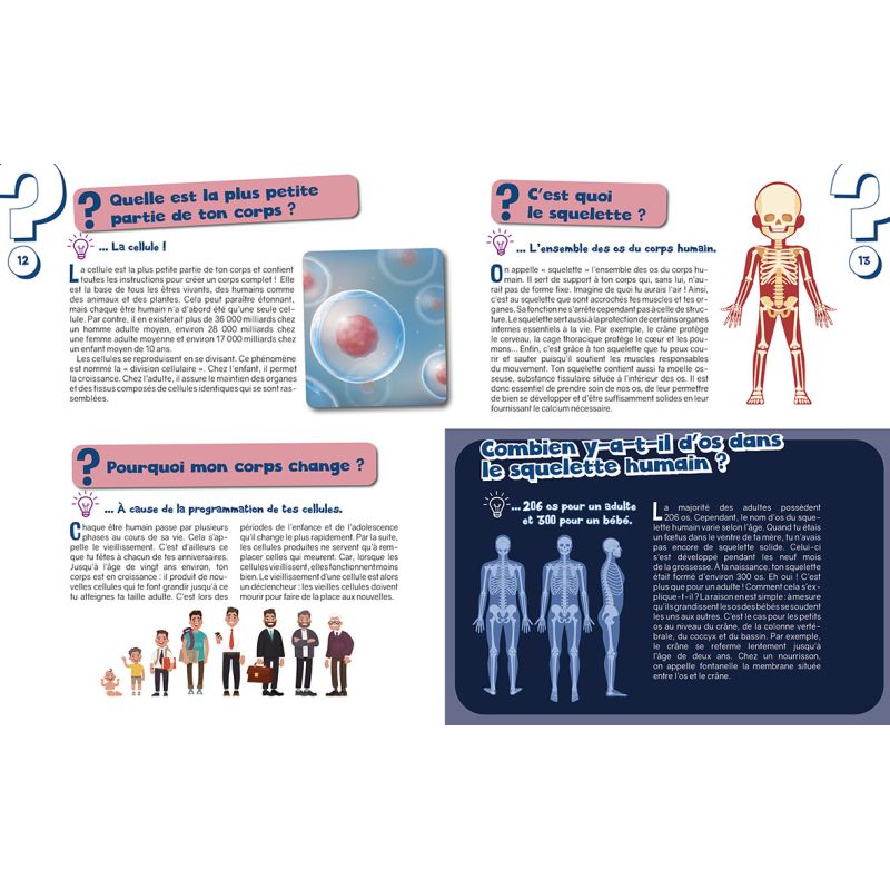 Sur le même principe que les titres précédents, « Mon livre des pourquoi comment sur le corps humain » propose de répondre à près de 200 questions sur le fonctionnement de l'être humain, d'un point de vue anatomique et physiologique. Le livre s'articule autour de 5 parties : Le corps humain, une formidable machine Les différents systèmes (nerveux, respiratoire, reproductif etc.) Les 5 sens La santé et la forme physique (alimentation, sommeil, activité physique etc.) Incroyable mais vrai : des anecdotes très surprenantes et amusantes. L'ouvrage apporte des réponses à des questions types telles que « Pourquoi ma peau se fripe dans l'eau ? », « Qu'est-ce que l'ADN ? » ou « Comment fonctionne un nerf ? », mais offre également des explications sur des questions plus anecdotiques telles que l'origine de l'expression « avoir la peur au ventre », ou pourquoi est-on parfois malade en voiture ou combien mesurent les ongles les plus longs du monde Points forts : Des réponses à des questions classiques et d'autres anecdotiques Des textes clairs et concis. L'auteur : Alice Delvaille a publié d'innombrables ouvrages aux sujets variés, tant pour la jeunesse que pour les adultes.
