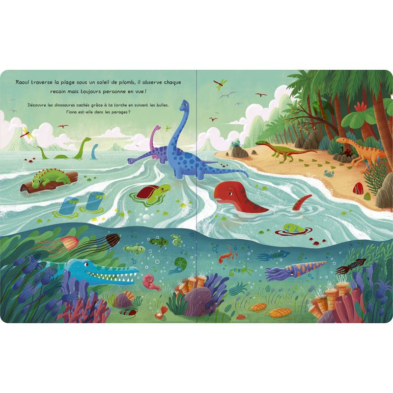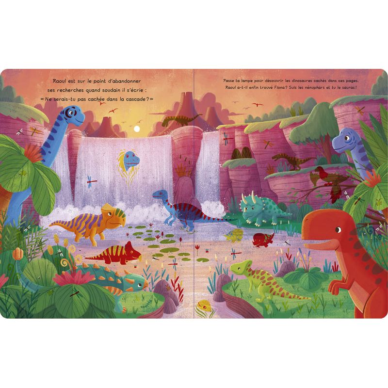 Cette collection de 4 titres propose un système de torche magique, incluse dans la couverture, que l'enfant va utiliser pour éclairer les décors des pages cartonnées afin d'en révéler les détails cachés. Dans ce titre, Raoul le T-rex part à la recherche de son amie Fiona l'apatosaure, en suivant les empreintes de pas qu'elle a laissées derrière elle. L'occasion pour Raoul de traverser de magnifiques paysages et de croiser d'autres dinosaures très surprenants ! Points forts : Un livre tout-carton bien solide Un emplacement sous blister repositionnable pour ranger la lampe Des thèmes classiques mais variés.