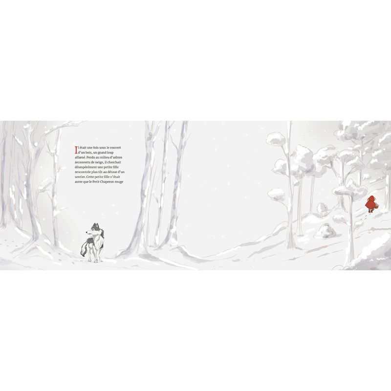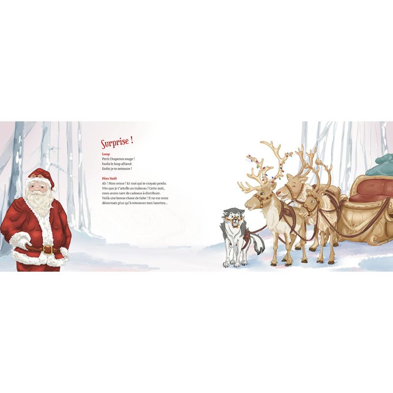 Un loup affamé qui part à la recherche du petit Chaperon rouge pour le dévorer, cette histoire semble sans surprises Mais c'est sans compter les rencontres farfelues que notre loup désespéré va faire en chemin, et les indications pour le moins hasardeuses qui vont lui être communiquées. La chute est très drôle : notre loup, confondant la petite fille de rouge vêtue avec le père Noël, se retrouve attelé au traîneau du vieil homme qui a égaré ses lunettes et l'a lui-même confondu avec l'un de ses rennes Points forts : Un conte revisité avec humour pour Noël Un univers graphique sobre et magique