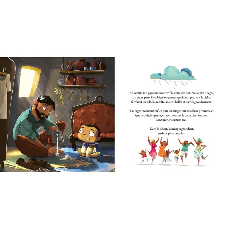 Le jour où j'ai écouté ma tristesse. « Mes émotions à lire » est une nouvelle collection de 4 petits albums dédiés au bien-être et au développement personnel des enfants. Le troisième livre de cette collection aborde le thème de la tristesse, toujours avec la volonté de parler du sujet des émotions à travers une histoire originale. Dans l'inconscient collectif, pleurer est un acte souvent perçu comme de la faiblesse, on va préférer se cacher ou même demander directement à la personne d'arrêter de pleurer. Des observations qui sont d'autant plus vraies chez les hommes, et malheureusement ces idées sont encore parfois transmises aux enfants. L'idée du livre est de prendre le contre-pied de la phrase « Les garçons, ça ne pleure pas ». L'histoire se déroule donc dans un décor de sécheresse, avec en personnages principaux un petit garçon et son père. Cela se passe dans un village au milieu du désert, la vie y est rude, les gens sont contraints de rester forts et de travailler dur. Mais ass