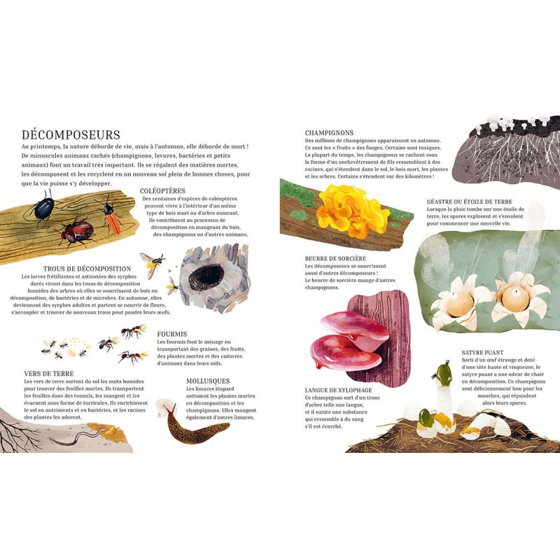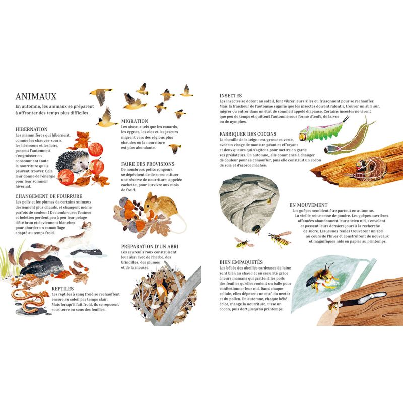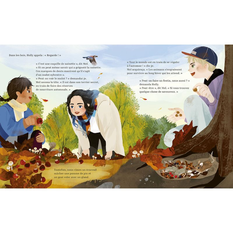 Rcolte dÕautomne : une nature gnreuse. Quatrime et dernier tome de la collection, ce bel album documentaire met en scne deux enfants qui profitent dÕune promenade pour dcouvrir la faune et la flore automnale. La nature leur offre un spectacle magnifique et regorge dÕoffrandes diverses. Sous la posie et le ton lger des deux personnages, les auteurs en profitent pour sensibiliser les enfants la beaut fragile de la nature. Ces dcouvertes vont permettre une ouverture sur une seconde partie documentaire, expliquant ce quÕil se passe dans la nature cette priode de lÕanne pour les vgtaux et les animaux, et de quelle manire nous pouvons les aider se prparer lÕhiver. Points forts : Un documentaire introduit par une histoire afin de faciliter la comprhension des plus petits. Des illustrations aux couleurs chatoyantes qui invitent la douceur. Le premier tome, Sommeil dÕhiver, a t un vrai succs !