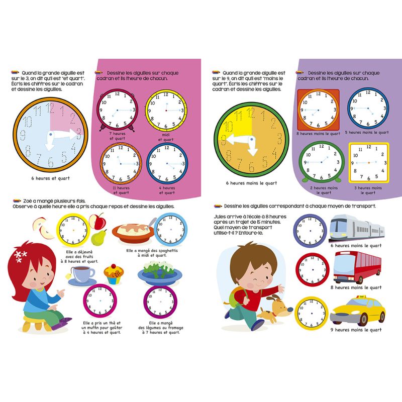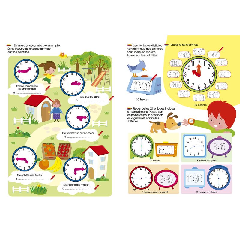 J'apprends à lire l'heure. Une nouvelle collection de cahiers illustrés pour les apprentissages élémentaires, sous la forme d'un livre ardoise qui permet d'écrire et d'effacer pour s'entraîner jusqu'à ce que les notions soient acquises. Des petits exercices sous forme de jeux permettent à l'enfant d'apprendre à lire l'heure en s'amusant. Points forts : Un cahier d'apprentissage ludique très illustré Un livre ardoise pour écrire et effacer à l'infini.