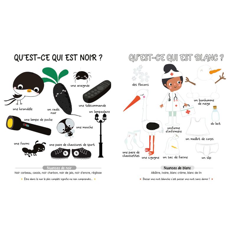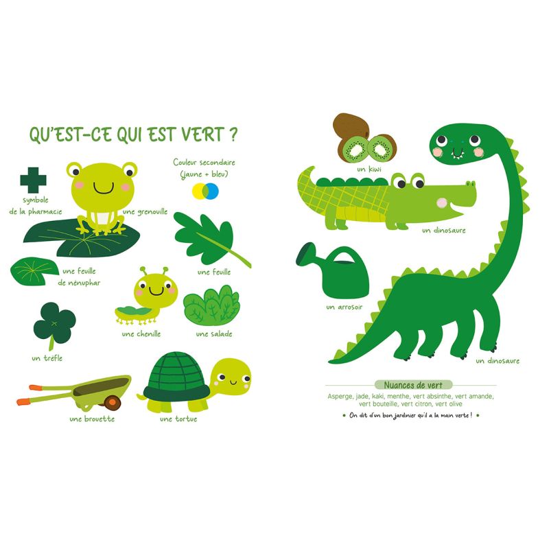 Mon livre des couleurs s'ouvre sur une comptine que les enfants apprennent à l'école lors de leurs premières années en maternelle, pour mémoriser les jours de la semaine en les associant à une couleur. Chaque couleur est ensuite illustrée par des éléments colorés qui la symbolisent et qui sont connus des plus petits. Il est question également des couleurs primaires et des couleurs secondaires, de leurs nuances aussi, mais tout est expliqué très simplement, afin que ce livre reste avant tout un moment de plaisir.