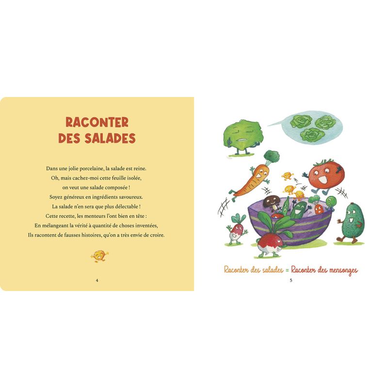Ce qui est évident pour un adulte ne l'est pas toujours pour un enfant, l'idée du livre est donc de lui donner des clés pour les comprendre et se les approprier. Chaque double-page est structurée de la même manière : l'expression en titre, une illustration rigolote pour illustrer l'expression, dans tout son aspect imagé et parfois surréaliste, et une petite comptine pour expliquer le sens de l'expression et son origine.