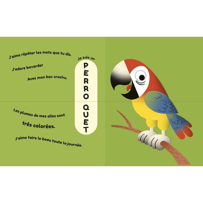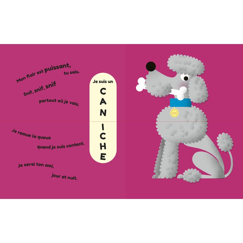 Un imagier ludique tout-carton sur le thème des animaux de compagnie permettant aux tout-petits de jouer tout en laissant libre cours à leur imagination. Tournez, combinez les pages et créez des animaux amusants ! Un cha-pin ou un perro-tue, les combinaisons sont multiples et le fou rire garanti. Les pages solides et la taille compacte sont parfaites pour les petites mains.