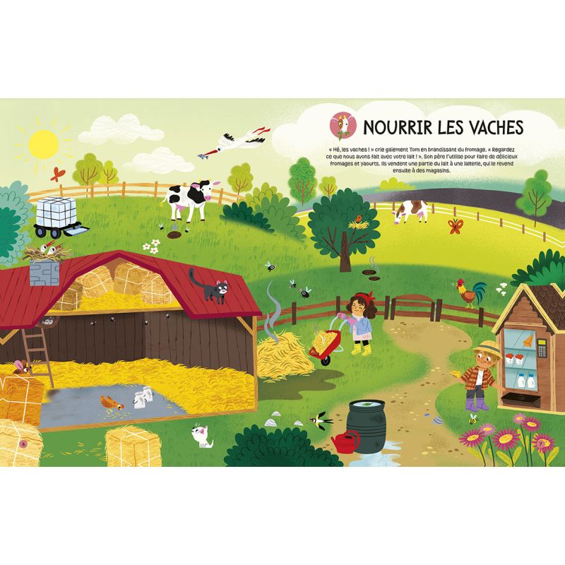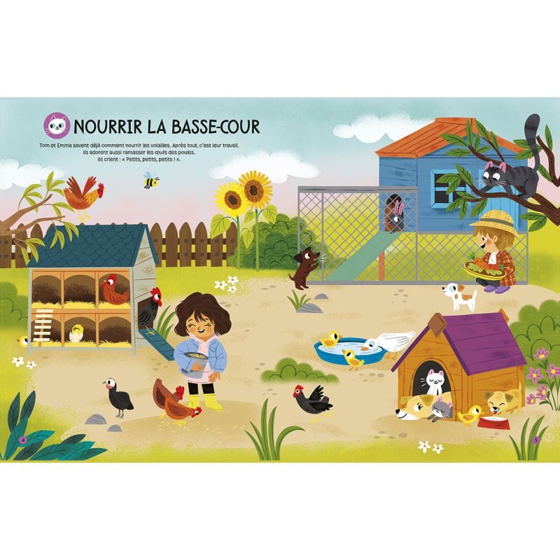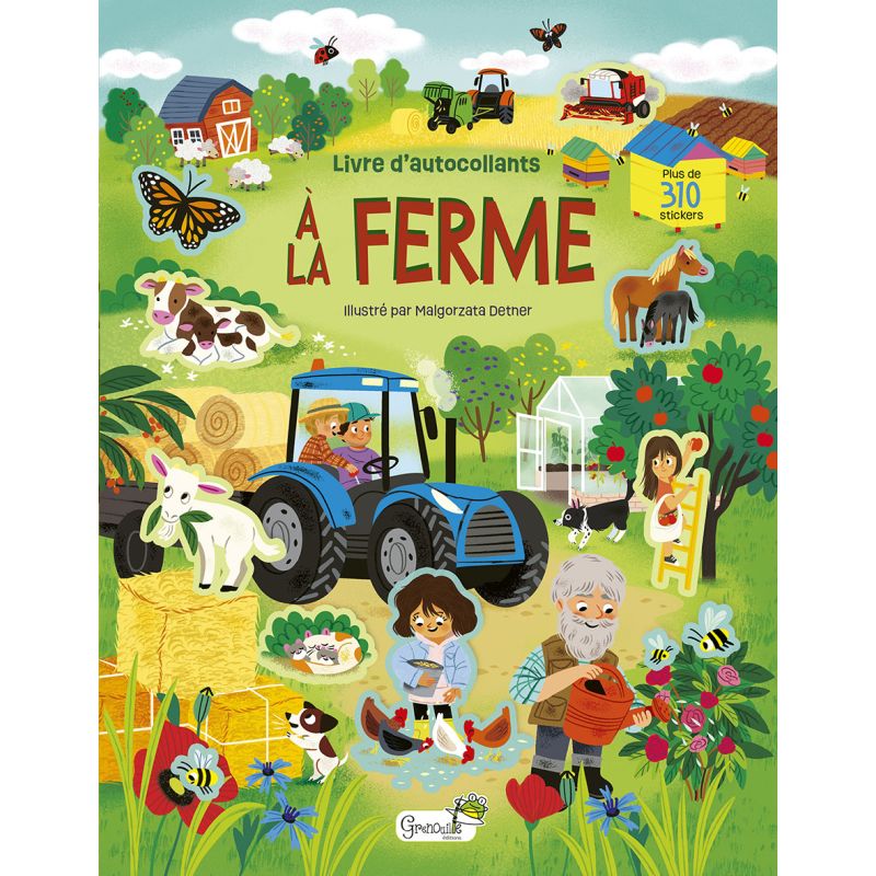 Un magnifique cahier de bonne qualité et aux superbes illustrations, incluant 8 pages d'autocollants à coller suivant les chapitres du livre et qui donneront à la fin une jolie histoire illustrée à raconter, sur la thématique de la ferme : nourrir les animaux, cultiver les fruits et légumes, les engins de la ferme, l'apiculture