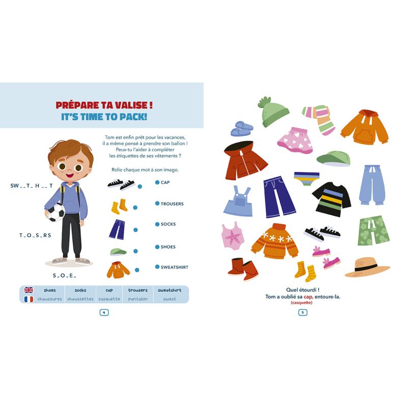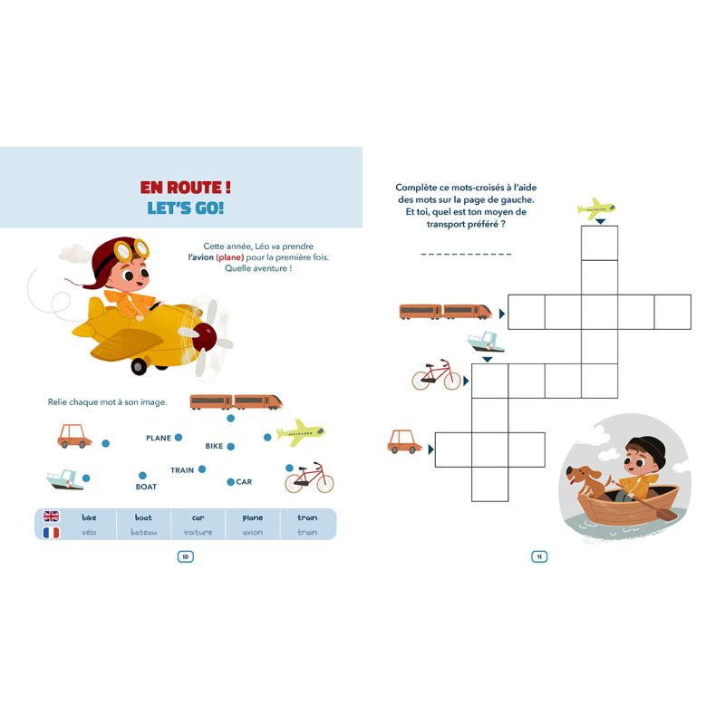 Des jeux simples avec des consignes en français : des mots croisés, des cherche et trouve, des labyrinthes, des phrases à lire avec le double vocabulaire, des mots à relier, etc.