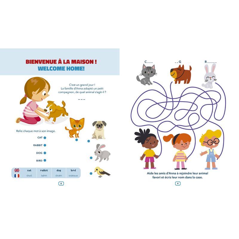 Des jeux simples avec des consignes en français : des mots croisés, des cherche et trouve, des labyrinthes, des phrases à lire avec le double vocabulaire, des mots à relier, etc.