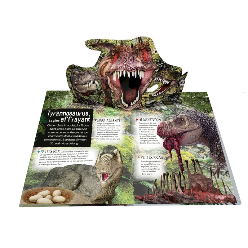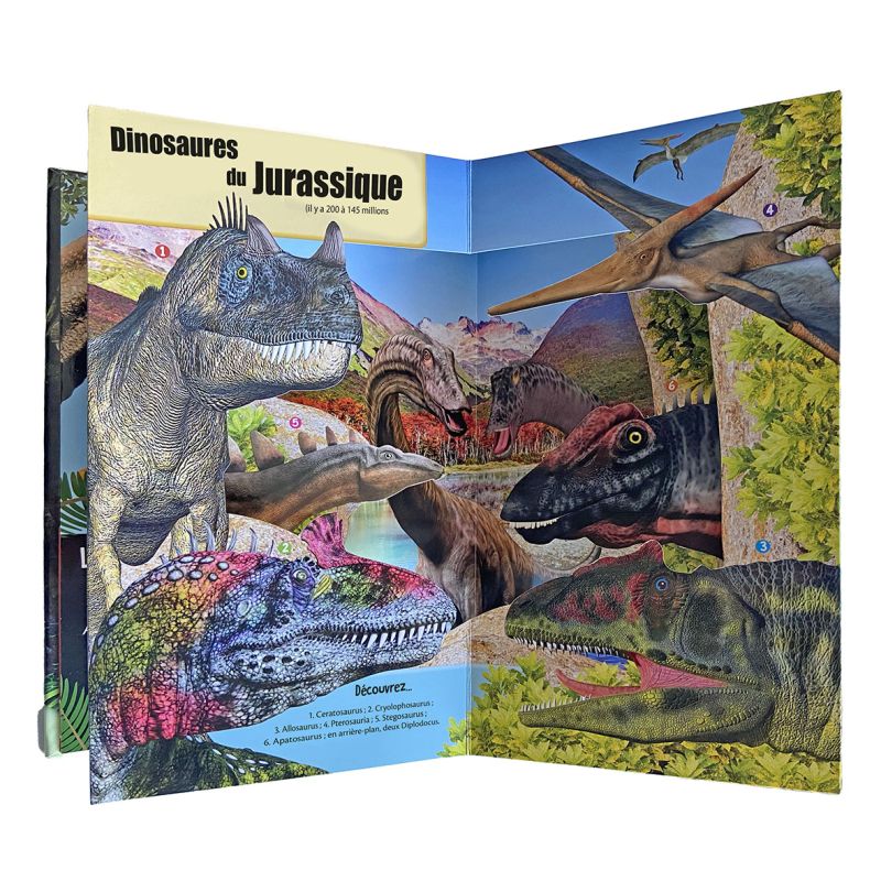 Chaque double page révèle des animations spectaculaires en relief : le rugissement du T. rex, le vol du ptéranodon, ou encore la marche des énormes sauropodes.