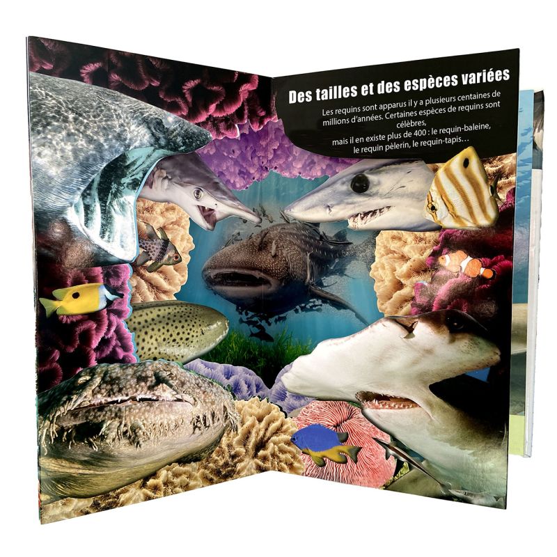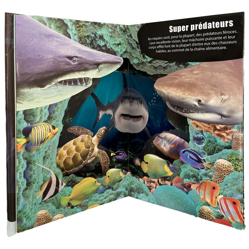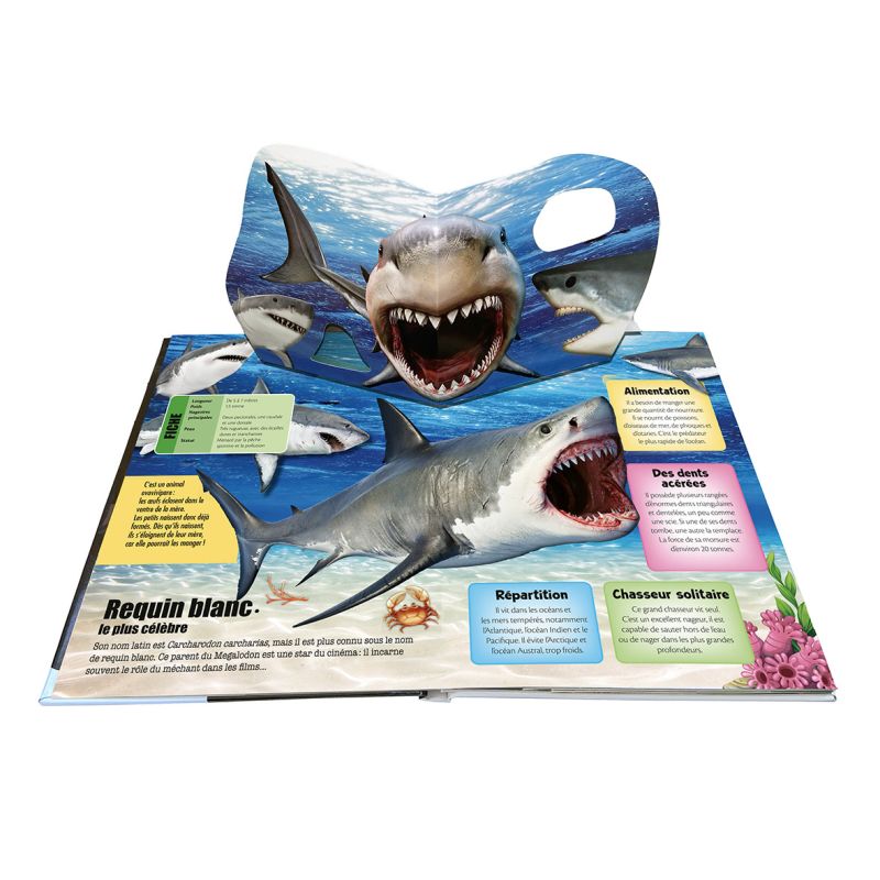 À chaque double page, des animations en relief donnent vie aux créatures marines tout en dévoilant leurs secrets : comment ils chassent, où ils vivent, à quoi servent leurs dents redoutables et pourquoi ils sont essentiels à l'équilibre des océans.