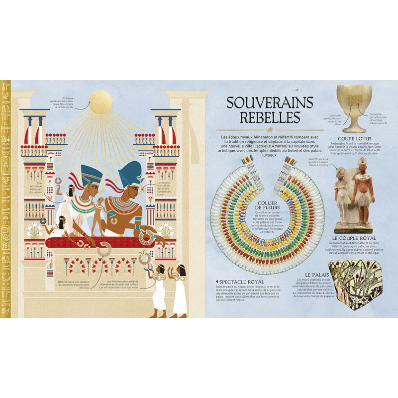 Des pyramides aux hiéroglyphes, des pharaons aux dieux égyptiens, en passant par la vie quotidienne, les rites funéraires ou encore les grandes découvertes archéologiques, chaque double page révèle des informations passionnantes et accessibles, conçues pour nourrir la curiosité des jeunes lecteurs et leur donner les clés de compréhension de cette époque lointaine.