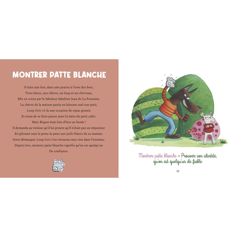 Chaque double-page propose une expression en titre, une illustration pleine d'humour mettant en scène l'expression de manière visuelle et souvent décalée, et une petite comptine qui explique le sens et l'origine de l'expression avec des mots simples.