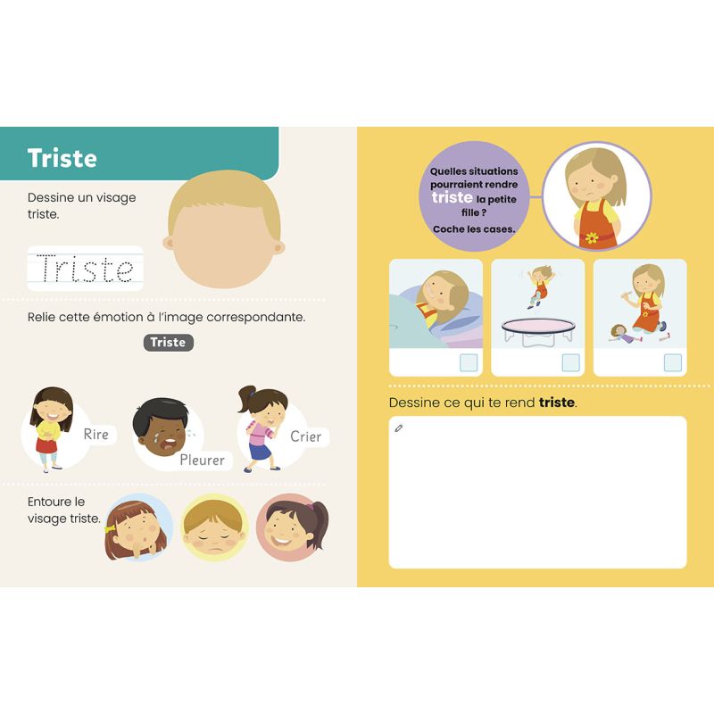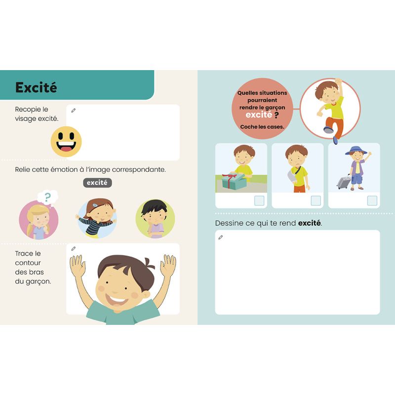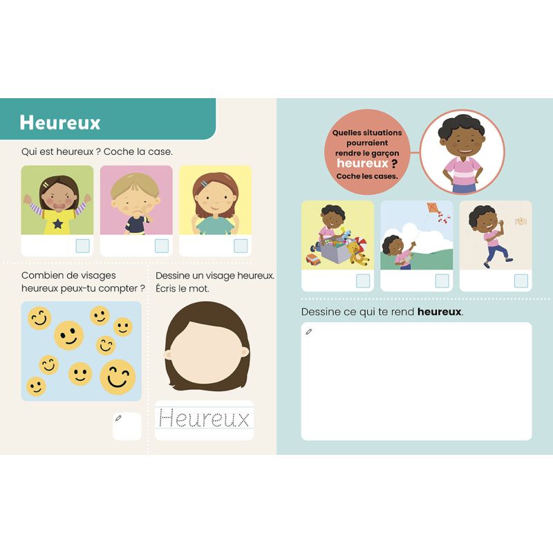 Un livre ardoise de 28 pages, accompagné d'un feutre effaçable, conçu pour éveiller la curiosité de l'enfant. À travers de petits exercices ludiques et variés (tracés, dessins et jeux), il l'aide à identifier et à mieux gérer ses émotions, tout en développant sa réflexion, son autonomie et en encourageant les échanges avec les adultes.