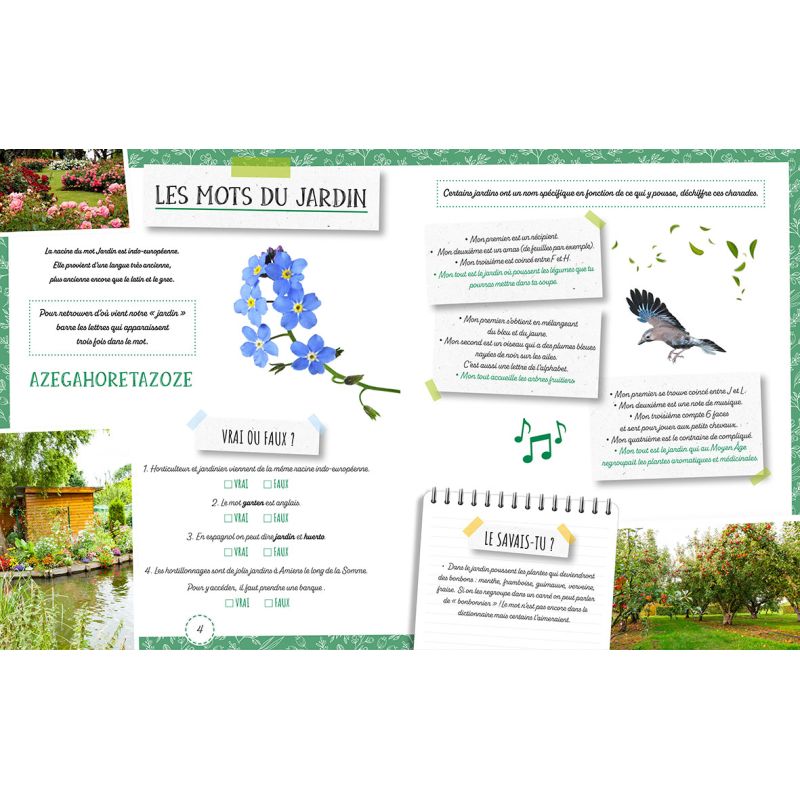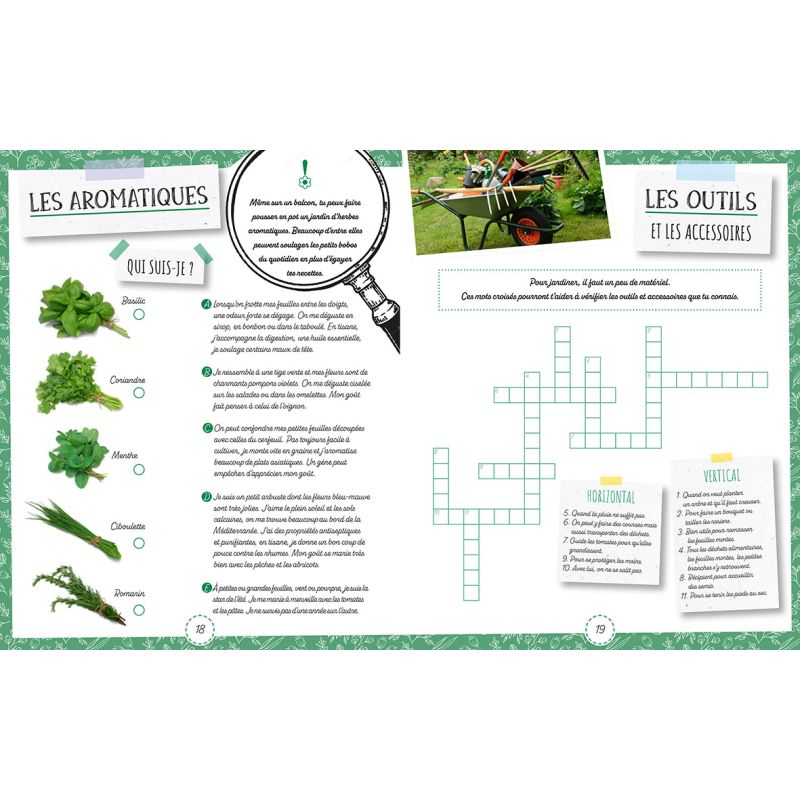 Ces jeux sont ponctués d'informations et d'anecdotes pour intéresser les enfants à la nature qui les entoure : vocabulaire spécifique lié aux plantes et au potager, outils et calendrier pour jardiner, reconnaître les plantes aromatiques, découvrir les insectes et les animaux amis du jardinier...