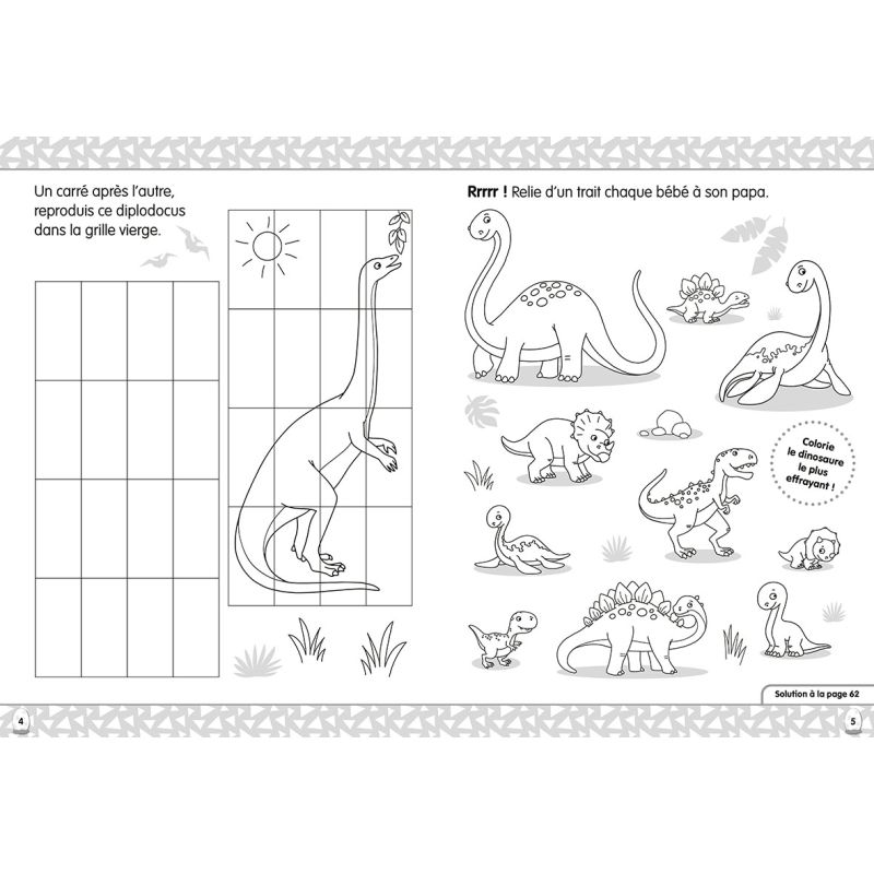 Labyrinthes, mots mêlés, jeux des ombres, jeux des différences, coloriages, énigmes, 64 pages de divertissement sur les dinosaures t'attendent !